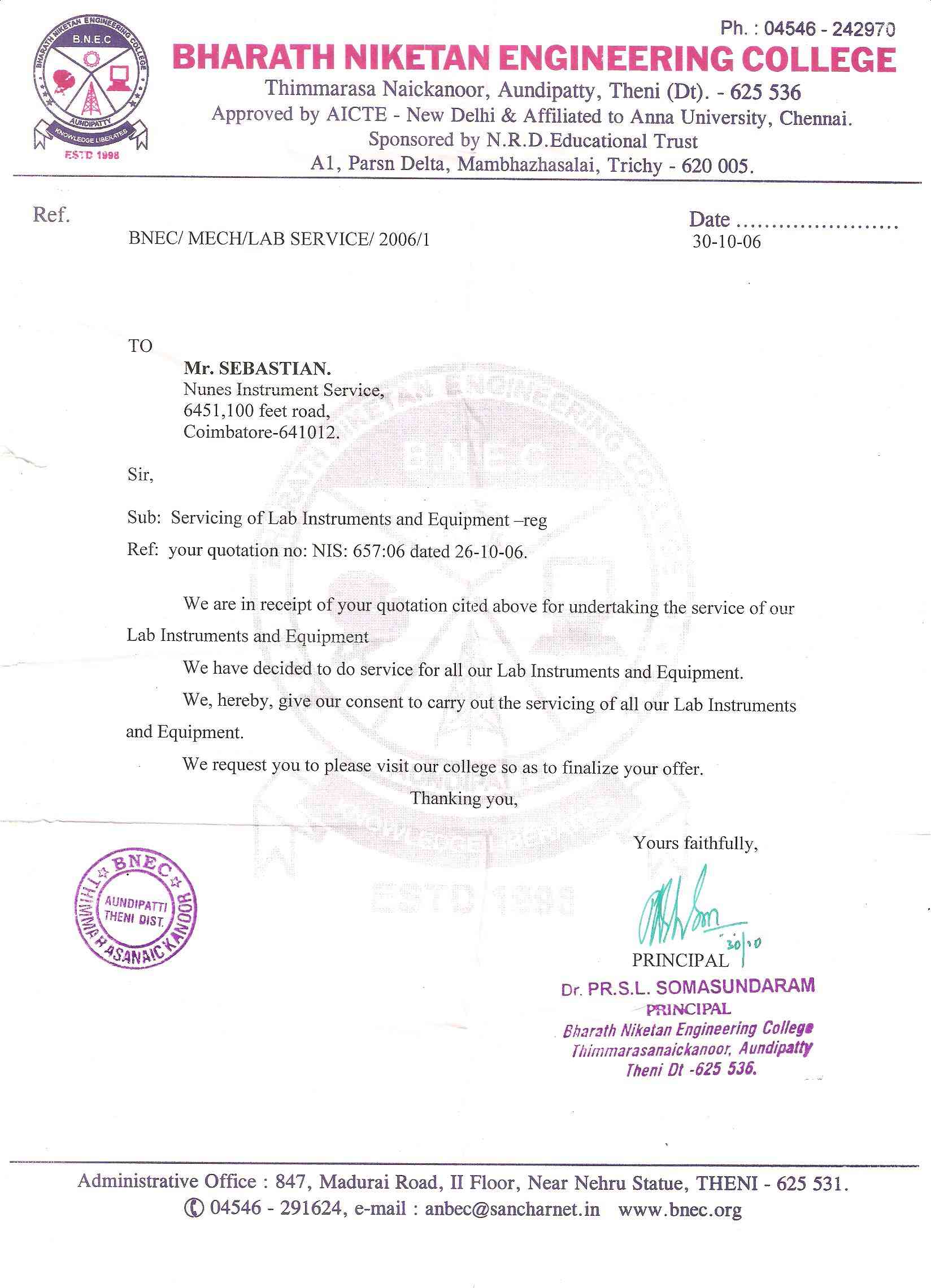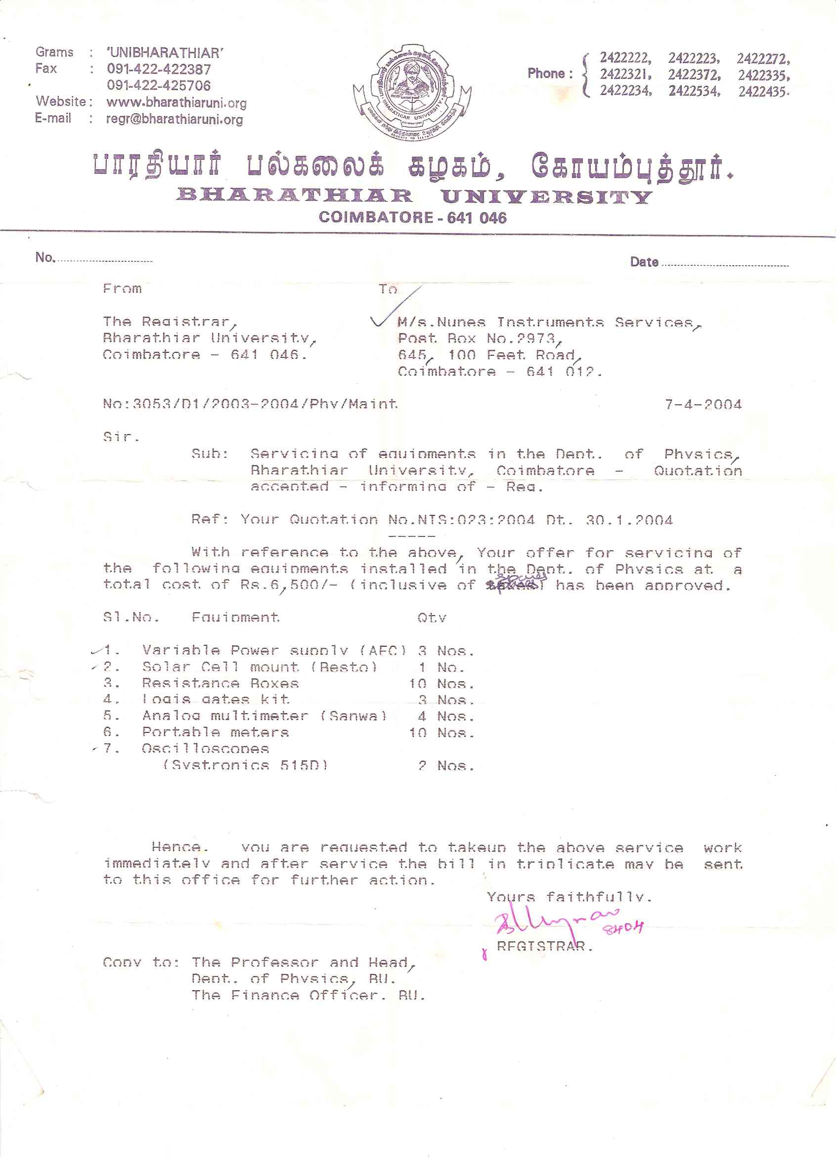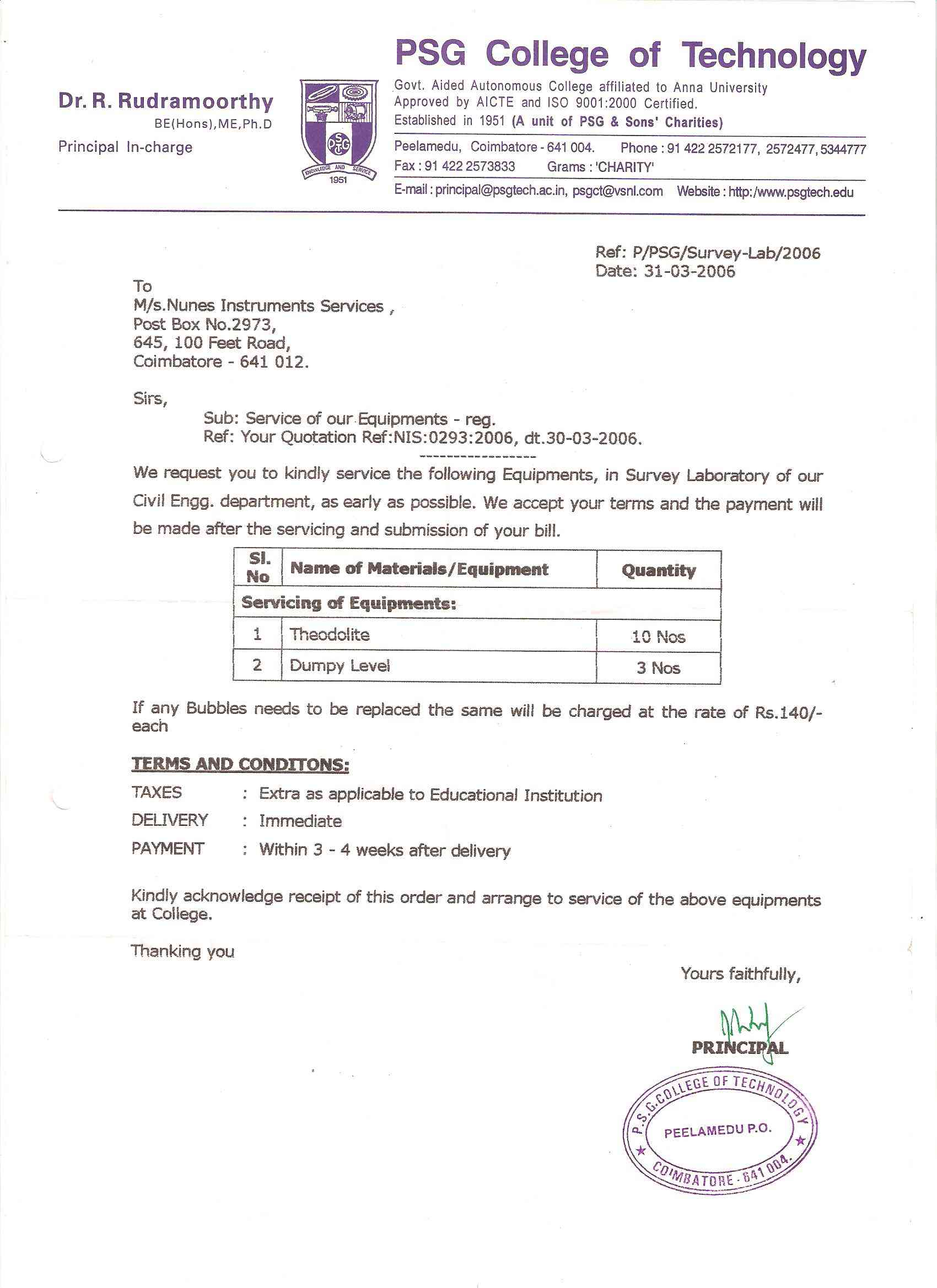 Nunes Instruments has a mobile team comprises of qualified engineers with necessary equipments and tools. With prior appointment, they visit your place and stay to carry out the repairs. This facility is Suitable for Engineering Colleges, Polytechnics and Government Organisation. Click here for the list of instituions we have served.